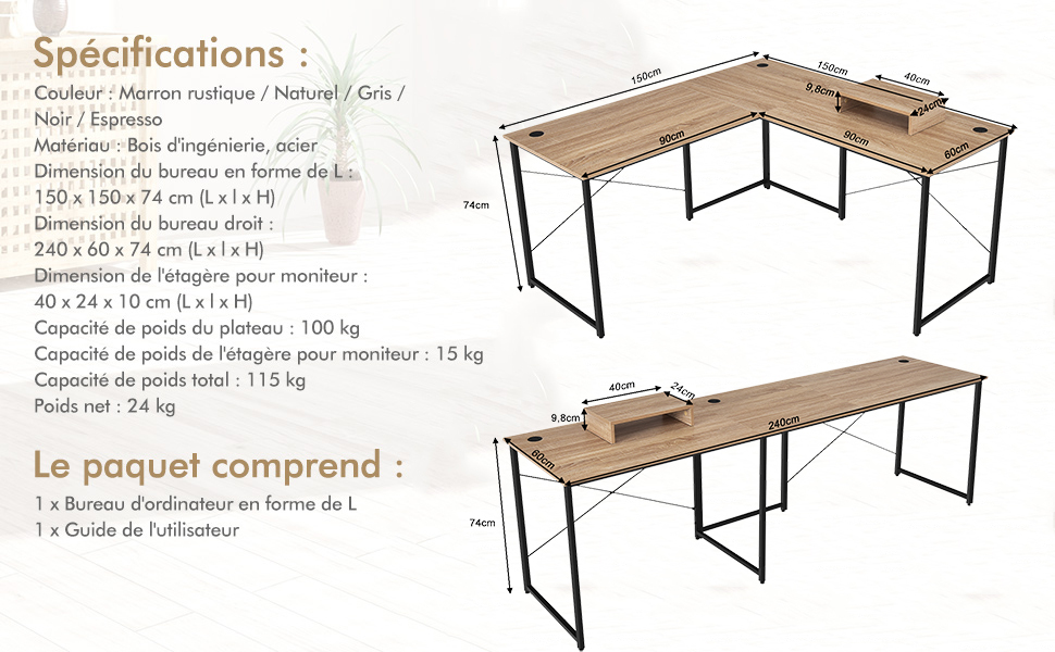【Conception convertible: 】2 formes de bureau:le bureau en forme de ‘l' de 150 x 150 x 74 cm peut être transformé en celui de 240 x 60 x 74 cm de long. Et quelle que soit la forme, le bureau réversible offre un grand espace pour que 2 personnes puissent travailler en même temps.