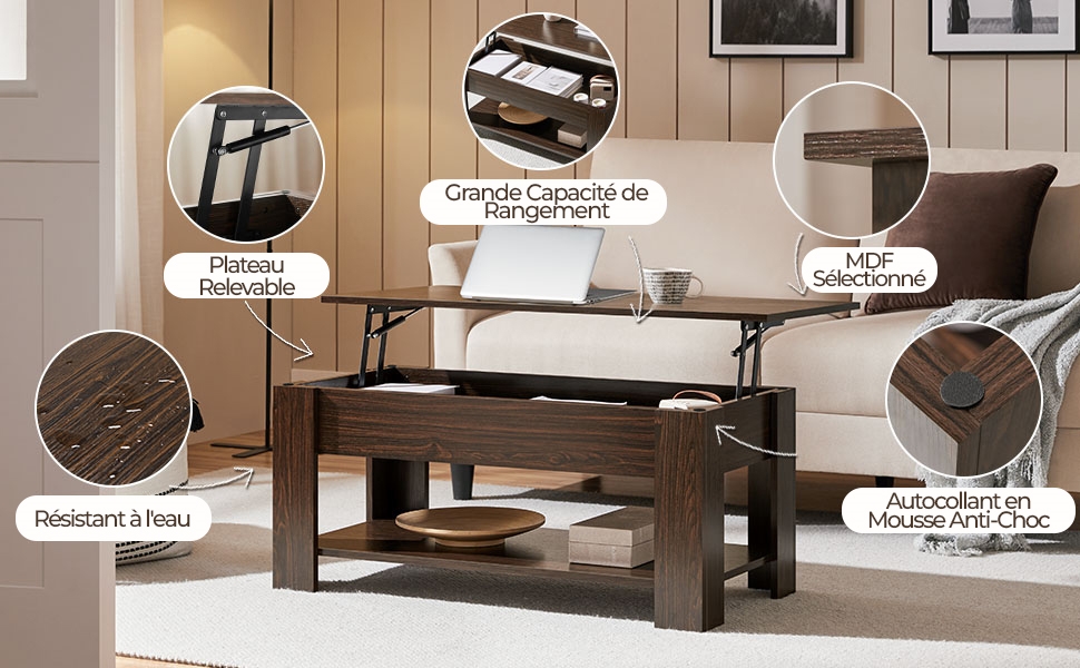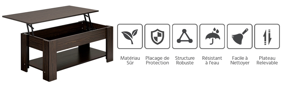 --Patins de protection : Cette table basse à plateau relavable comprend 8 coussinets en mousse qui sont placés entre le plateau supérieur et les pieds de la table. C’est pour amortir les chocs, en assurant une descente du plateau sûre et silencieuse.
