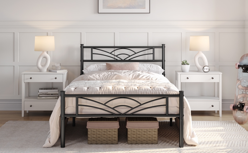 Rafraîchissez votre chambre avec ce cadre de lit. Minimaliste, mais stylé, ce lit en métal est joliment conçu avec une silhouette épurée et une tête de lit aux motifs ""nuages"" , ajoutant une touche élégante à votre intérieur. Soigneusement conçu avec des renforts d'angle et des patins antidérapants, ainsi que les hautes barrières pour bien fixer le matelas. Le grand espace sous le lit vous permet de ranger vos affaires en cachette et sans encombrement. Passez une nuit douce avec notre cadre de lit.