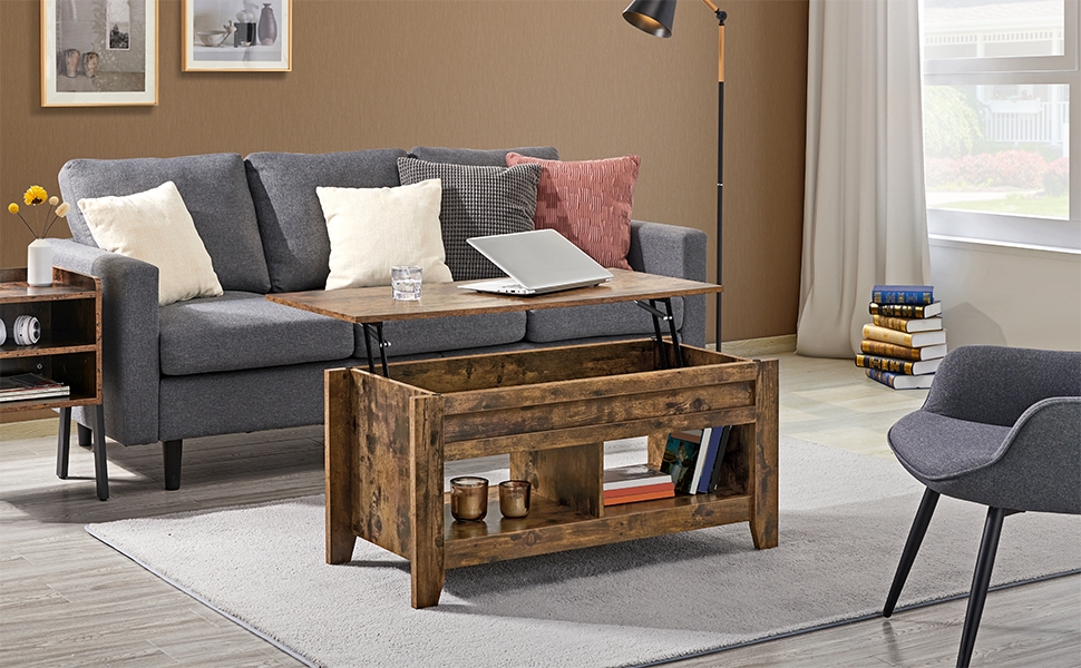 Cette table basse à plateau relevable est un ajout chic et pratique dont le plateau peut être facilement ajusté à une hauteur appropriée et confortable pour utiliser un ordinateur portable, écrire ou dîner assis sur le canapé. Sous le plateau, c'est un grand espace de rangement pour garder les objets utilisés quotidiennement à portée de main et propres. Deux étagères inférieures cloisonnées peuvent ranger des paniers de jouets ou mettre en valeur des objets décoratifs préférés. Recouver d'un revêtement imperméable et d'une quincaillerie en métal robuste, il est facile à nettoyer et la capacité de charge jusqu'à 55 kg au total, la table est solide et robuste pour votre usage quotidien.