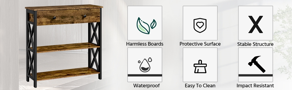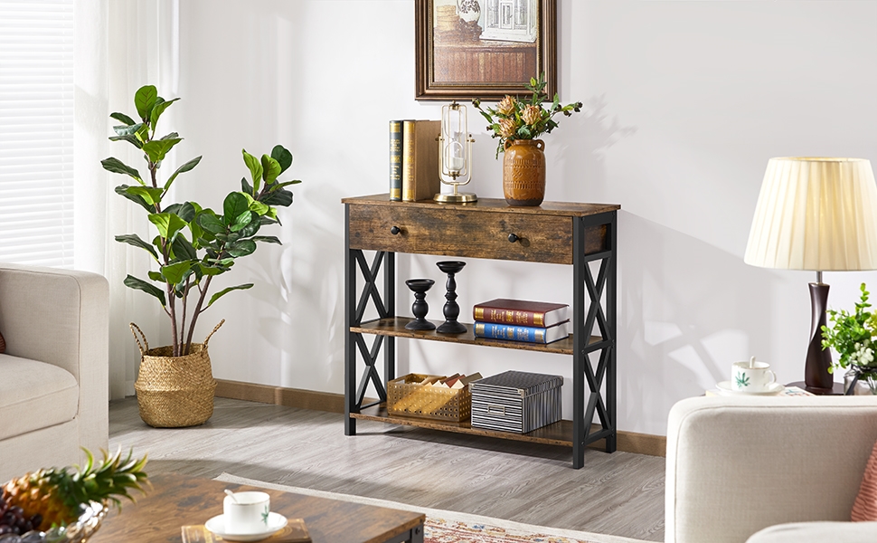 2. Stockage multiniveau: Dotée d’un tiroir et de tablettes, cette console meuble vous offre un espace de rangement spacieux. Vous pouvez ranger dessus des plantes, des cadres photo, des livres, des corbeilles, etc