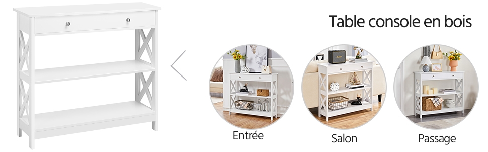 3. Grand volume : Cette console avec tiroir vous offre un grand espace de rangement. Son plateau supérieur peut accueillir des bibelots décoratifs. Son grand tiroir à 2 boutons et ses étagères à 2 niveaux vous aident à ranger des objets en ordre.