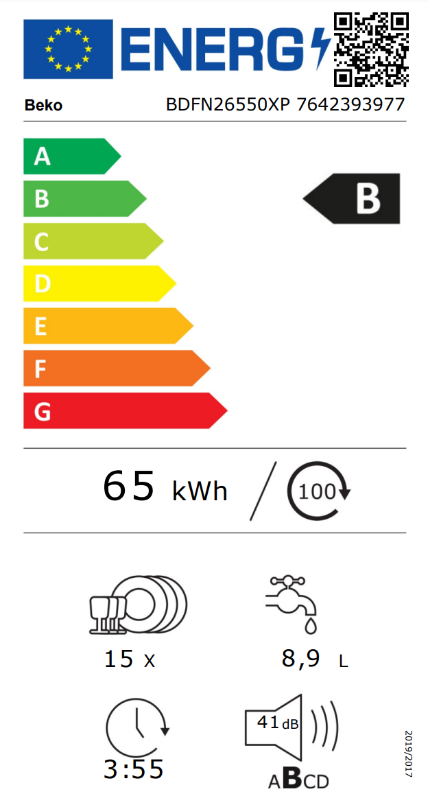 Le lave-vaisselle pose libre BEKO BDFN26550XP est un modèle performant et économe en énergie, classé B, avec une consommation de seulement 65 kWh pour 100 cycles.